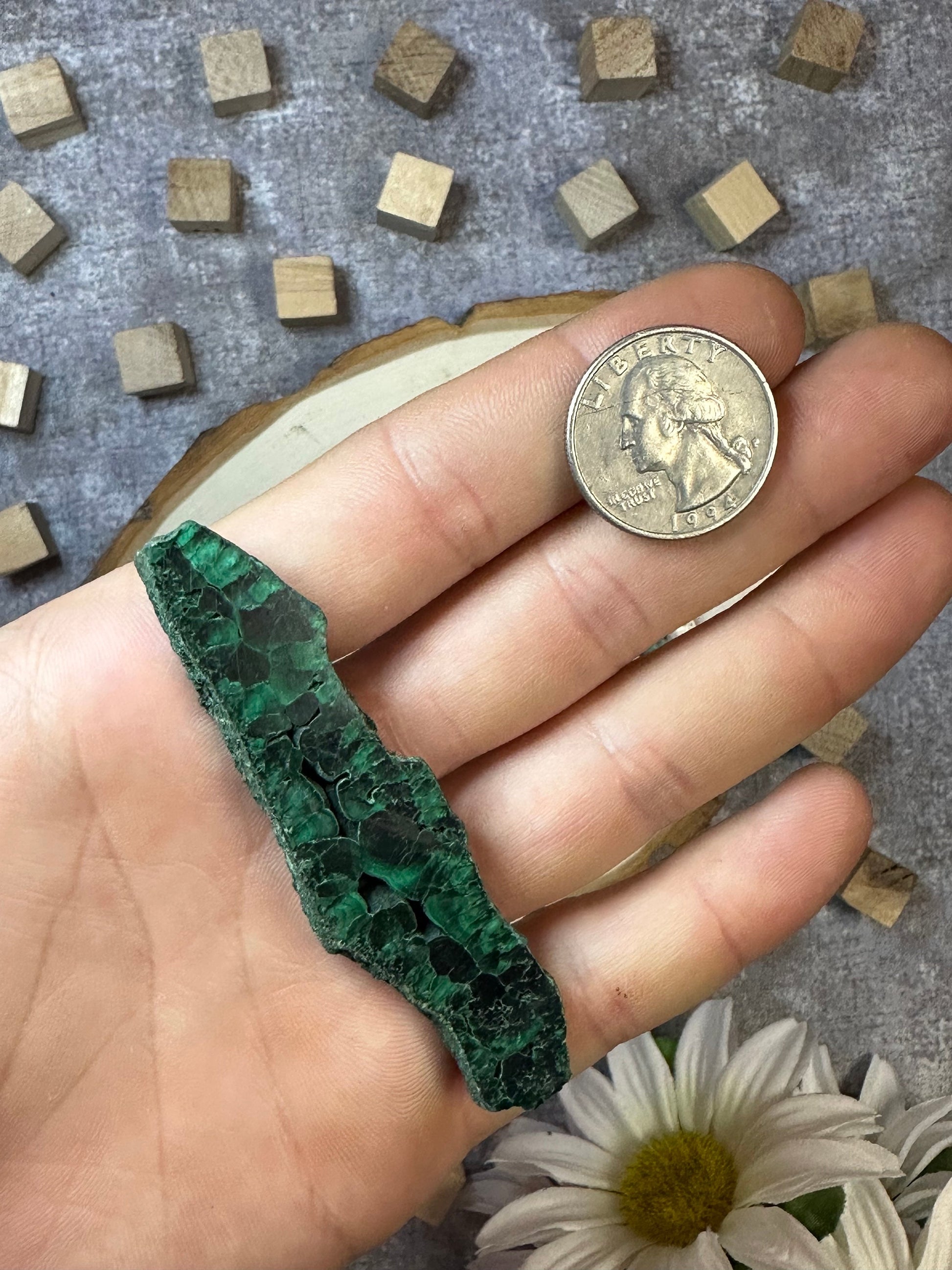 Malachite is found in many parts of the world, including Russia, Australia, Zambia, and the Democratic Republic of Congo. This particular Malachite slab is from the Democratic Republic of Congo.